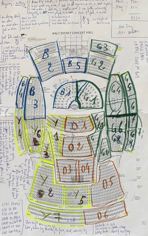 crowd out was first presented in Birmingham, UK at Millennium Point in 2014 under the direction of Simon Halsey, but it was until 2019, after several performances in London, Berlin, and Chicago, that the addition of a choreographic component was entrusted to Dimitri Chamblas for the presentation of the piece at Fluxus Festival, curated by Kate Nordstrum, at the Walt Disney Concert Hall in Los Angeles.