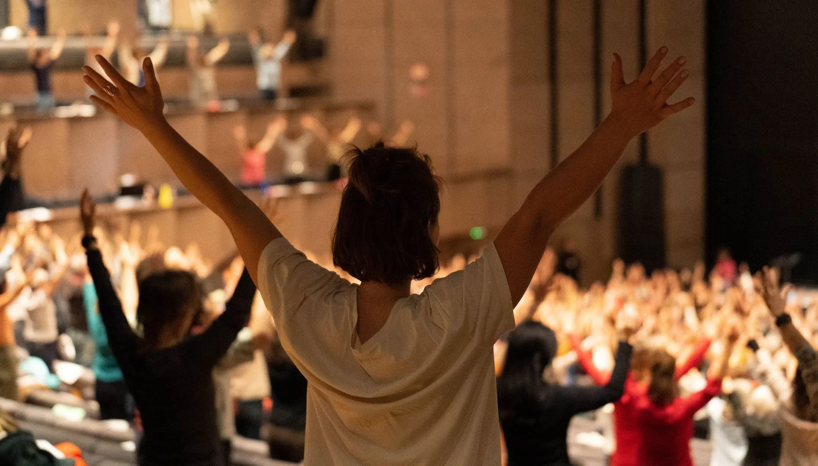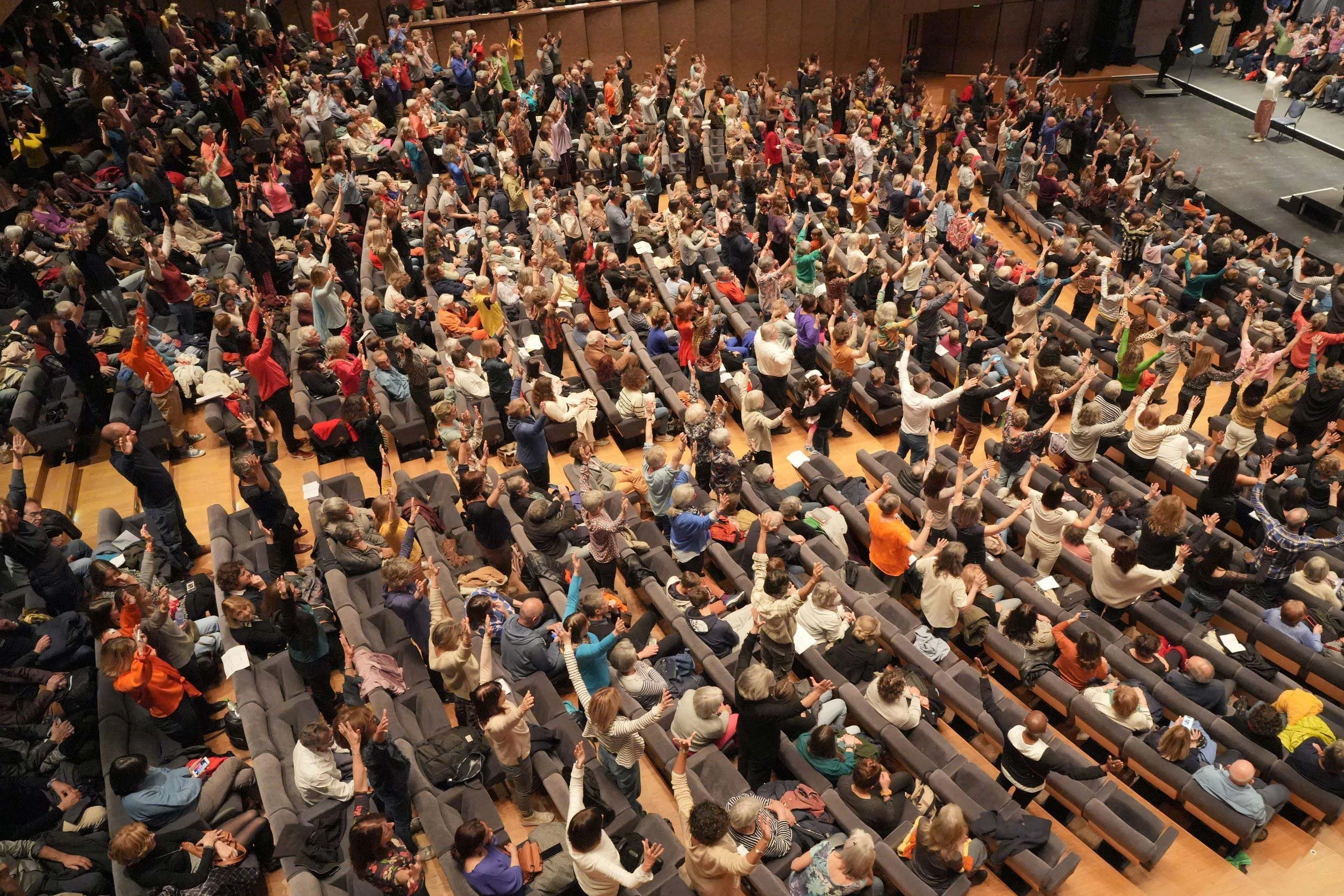 crowd out is brought to life by a huge crowd formed indiscriminately by performers and an audience. 1000 voices are spread out: on stage, in the orchestra or on the different levels or balconies. The singers mingle with the audience to perform a piece of words written by composer David Lang, directed by a conductor, and staged by Dimitri Chamblas.